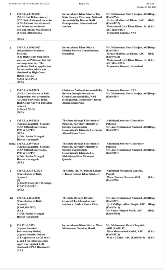 The Supreme Court will also hear petitions related to the Cipher case, including appeals filed by the State against Imran Khan’s acquittal, as well as a petition concerning the framing of charges under the Official Secrets Act. Additional matters include NAB-related proceedings, where bail and conviction issues remain pending, and petitions arising from the Al-Qadir University Trust case.